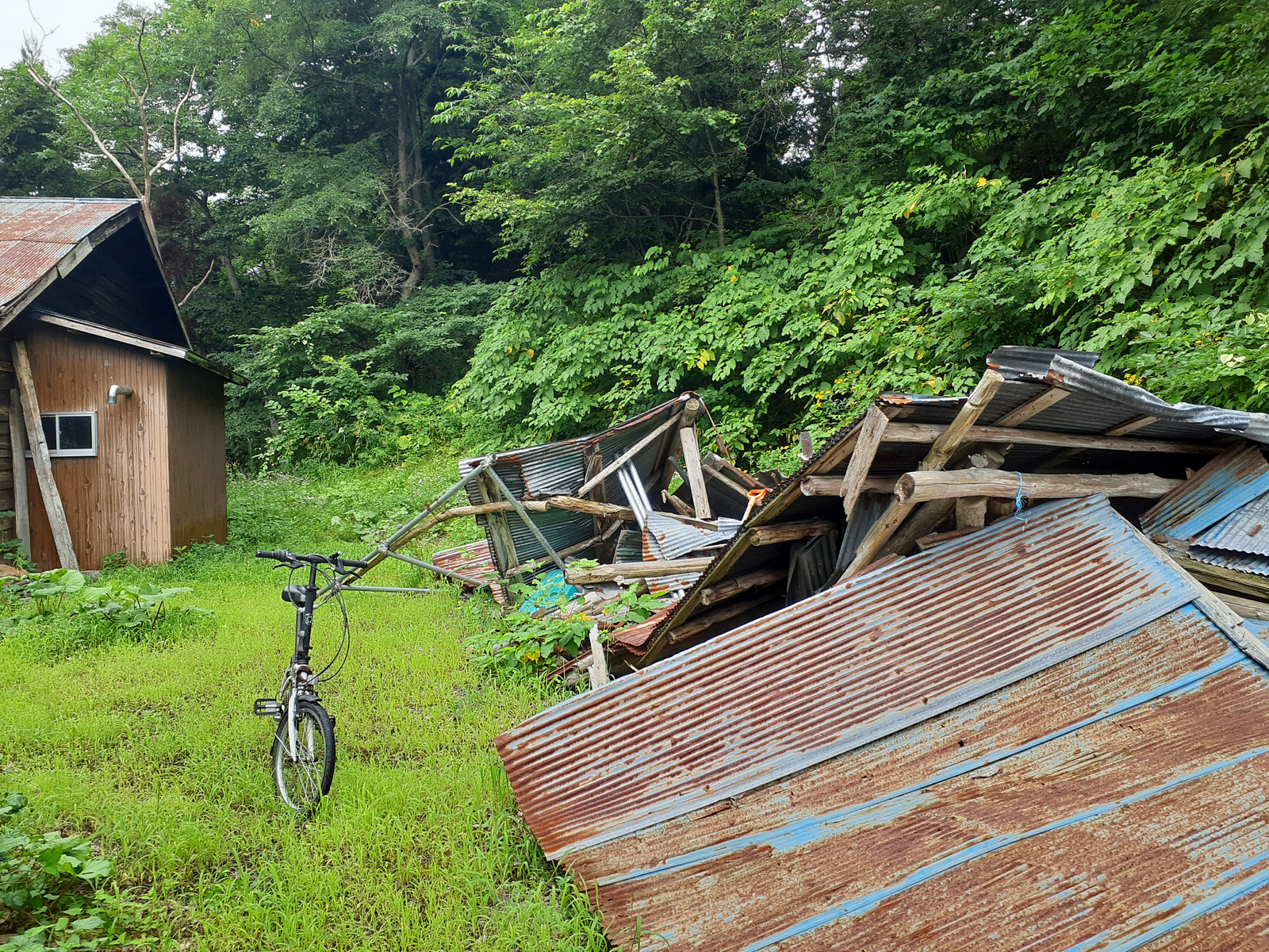 さて、オタモイ山の上に続く破線(国土地理院の地図)がこの倒壊した建物あたりから出てるんですけども‥ないっすね、道。上の写真にあった砂利道がまだずっと続いているっぽいんですけど、あれ以上先行っても登山口が見つかる保証もなければ上り坂登る時間も無駄ですので、ここで手打ちです(滅