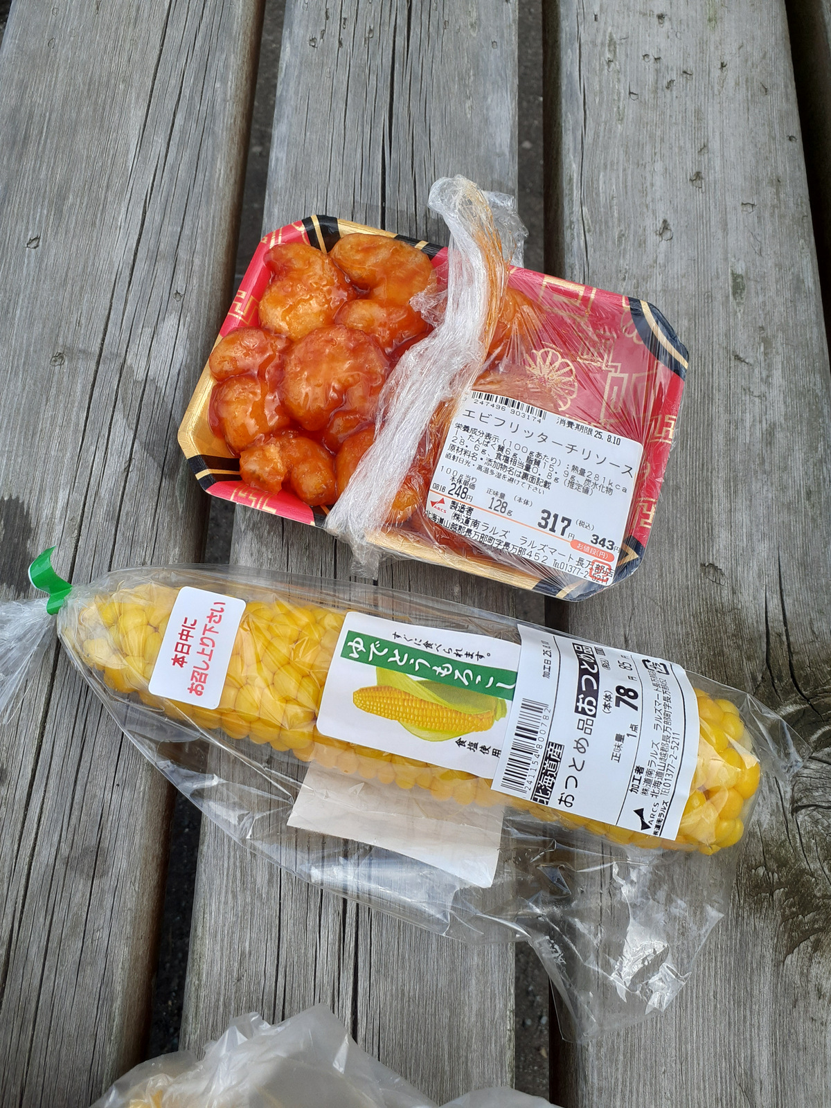 長万部駅前に戻ってきたらスーパーがあったのでそこで惣菜を買って食べることとします。菓子パンみたいな甘いの、なんか受け付けないんですよ。それがエビチリとゆでとうもろこしってのもどうなのって思いますけども。