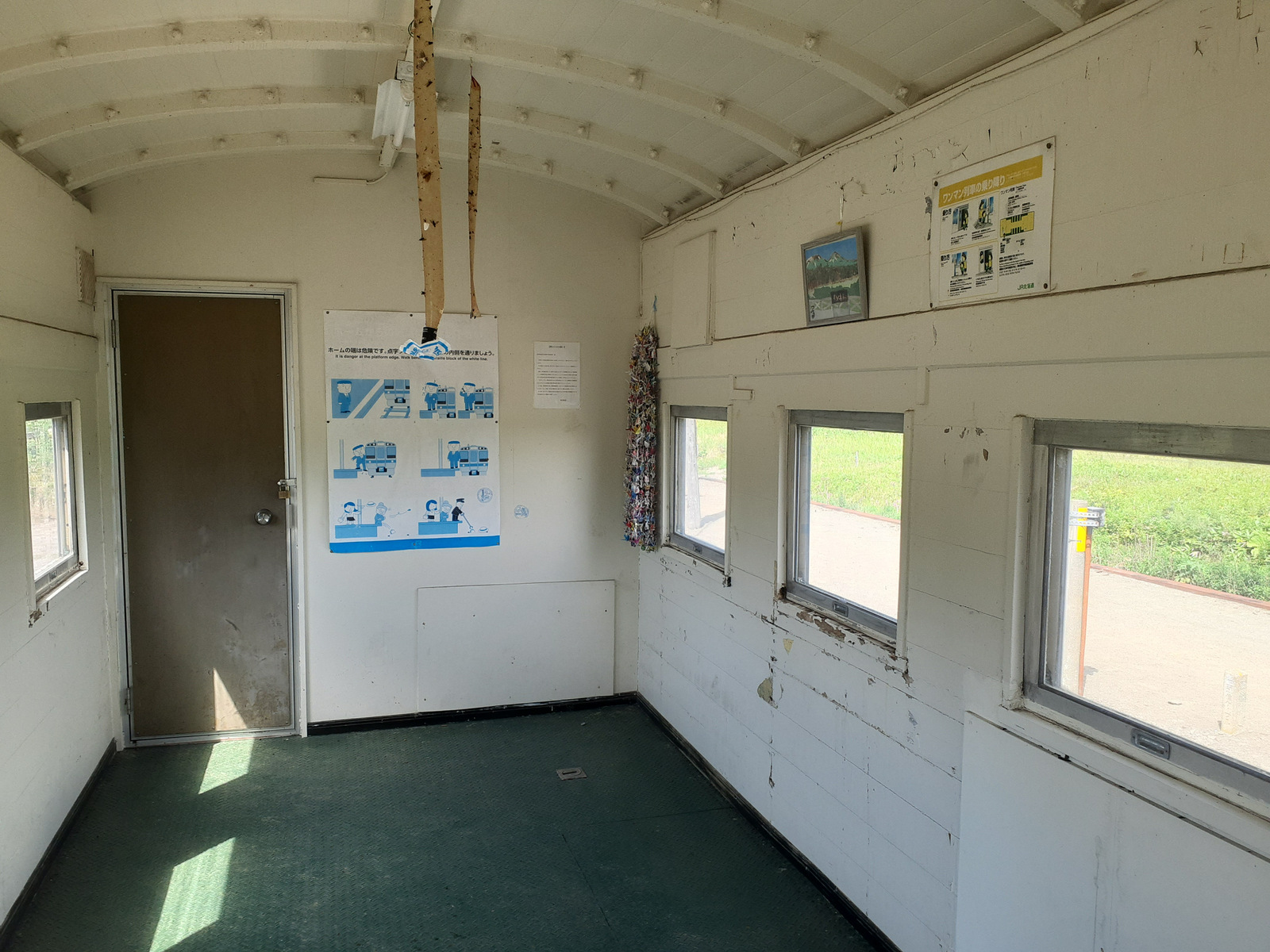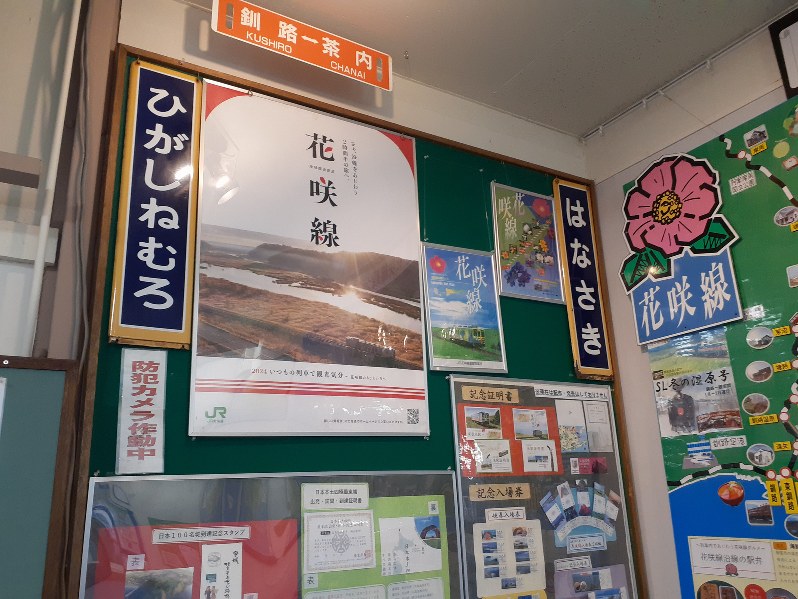 この千羽鶴‥のことじゃなくて、貼り紙です。駅舎内の展示物はいったん全部撤去してね、ということです。性善説で色々なものの展示を許していると、思わぬ事件や事故につながることはありますね。さっきの交流ノートも、旅の思い出とかを書く分にはいいですが、エスカレートしてSNSみたいになるかもしれませんしね。それでも、こういう対策を取らないといけないのは、悲しいですね。
