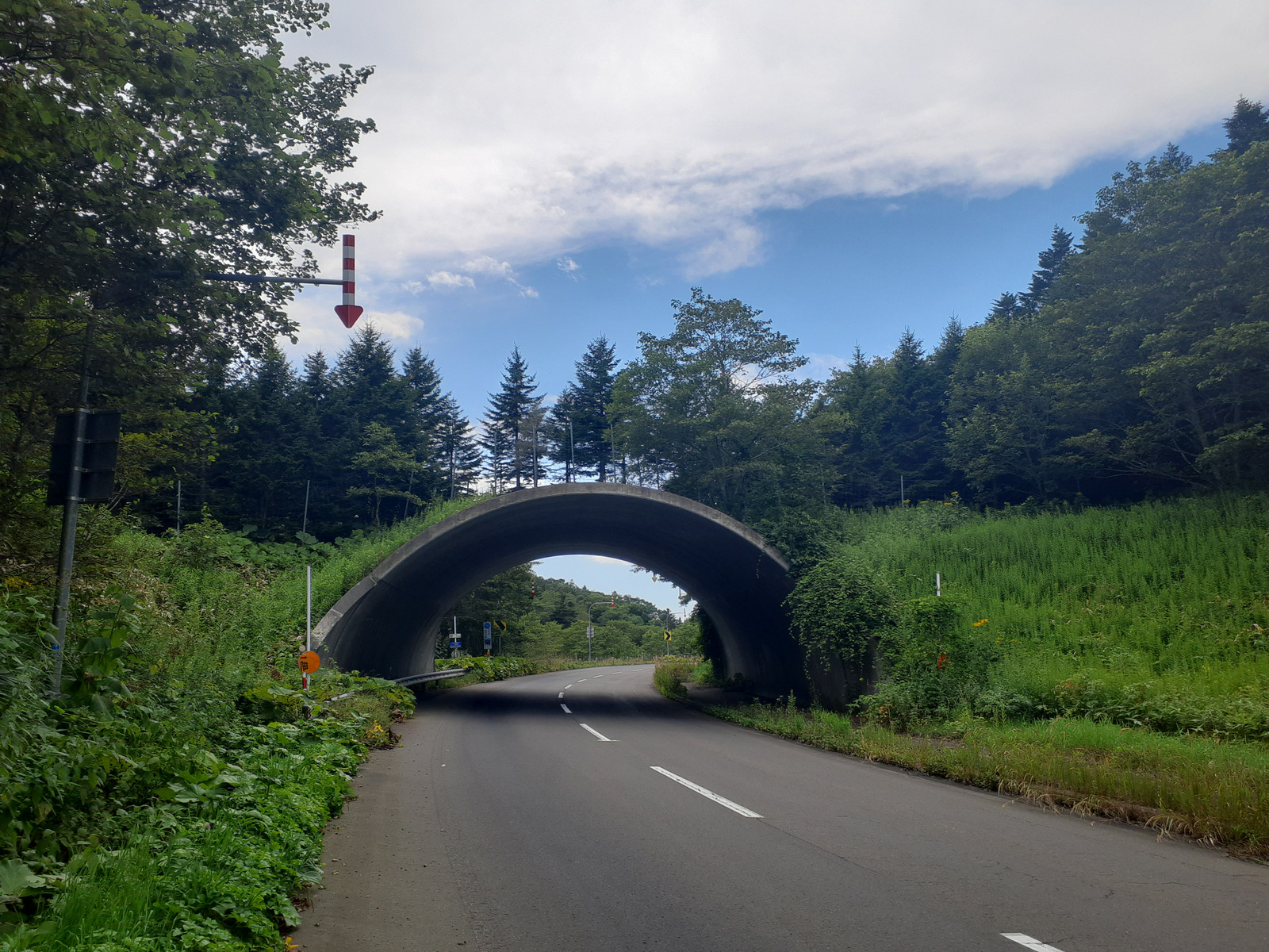 花咲港から西和田駅に向かっています。トンネル?シェッド?変な構造物があります。土被り(どかぶり、トンネルの上の土の厚さ)がほぼないけど、上に木が生えています。なんですかね、これ。