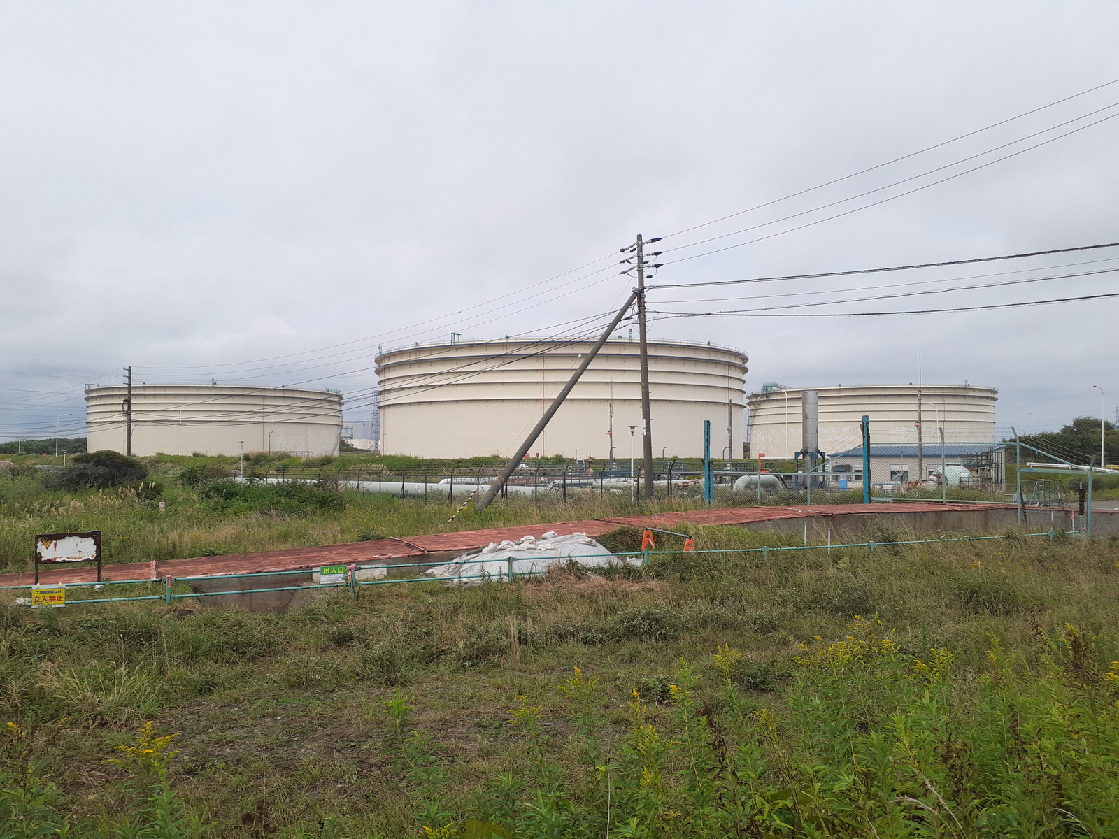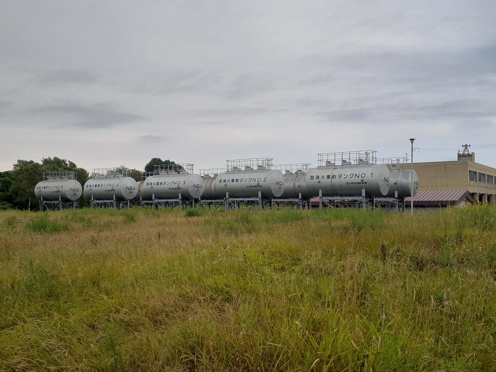 泡消火薬剤タンクがこんなにたくさん!!このあたり、石油備蓄基地もあるし、大火災が起こったら使うしかない、ということになるのでしょうね。使わなかったら火災で多くの命が失われるかもしれない。でも、使ったら間違いなく泡消火薬剤なるPFASは環境にばらまかれます。