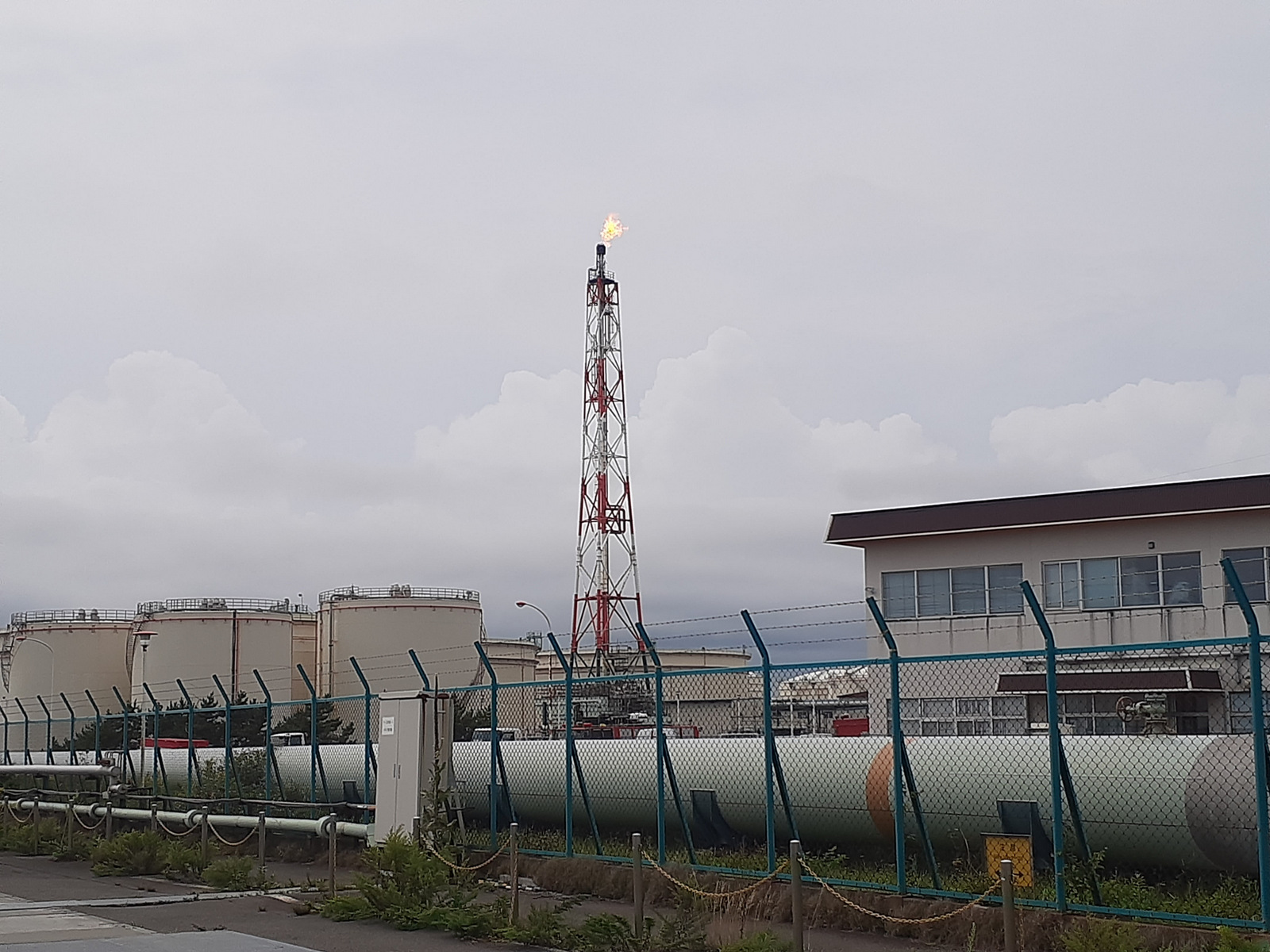 あの煙突、炎が上がっています。二酸化炭素発生させまくり、とも思いますが、有害な炭化水素の気体を撒き散らすよりはマシですね。芳香族化合物の多くは有害ですね。しかたないね。排出せずに再利用などできればいいですね。